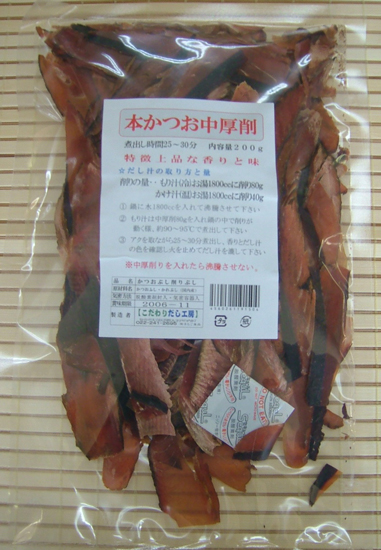 【荒本節】と【本枯節】を創業30余年の経験で培った弊社独自ブレンドです。多くの職人さんからも長くご信頼を頂いている業務用の削り節を200gの少ない入数にしました。名 称 : かつおけずりぶし(荒本節・本枯節) 主な産地 : 国内産(鹿児島県、静岡県)内 容 量 : 200g 賞味期限 : 製造月より8ヶ月(未開封時) 気密方法 : 気密性チャック袋、脱酸素剤封入